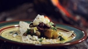 - Lefse med potetsalat og grillet reinsdyrkjøtt servert på fat fra Potteriet Røros. Foto: TV2 Sumo